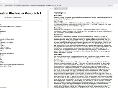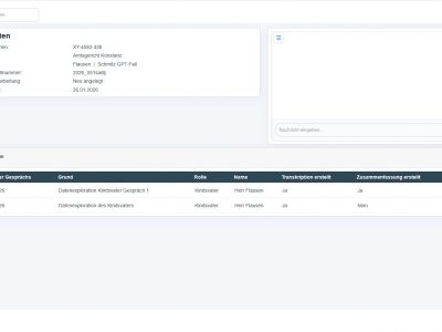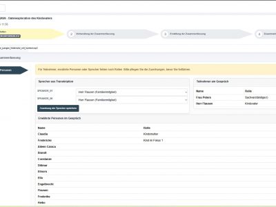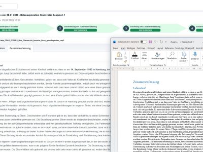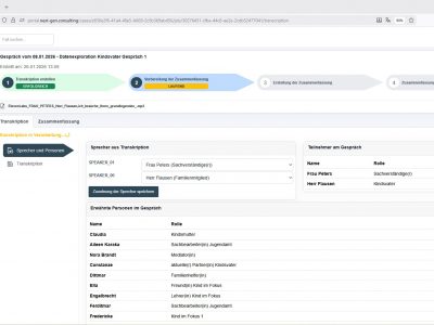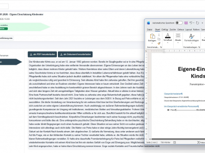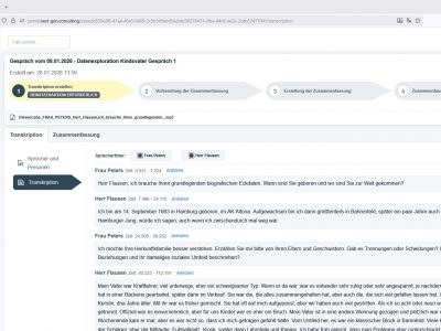 Für Familienpsychologen verbinden wir KI-Transkription von Explorationsgesprächen mit einer darauf aufbauenden KI-Zusammenfassung. Aus Gesprächen mit Kindesmutter, Kindsvater oder dem betroffenen Kind(ern), aber auch z.B. Ärzten oder dem Jugendamt entsteht neben dem wortgetreuen Protokoll eine strukturierte Arbeitsgrundlage im Konjunktiv I für die gutachterliche Bewertung.